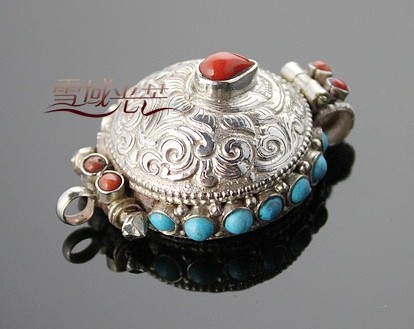 This tibetan gau pendant was made from old sterling silver, turquoise and coral.